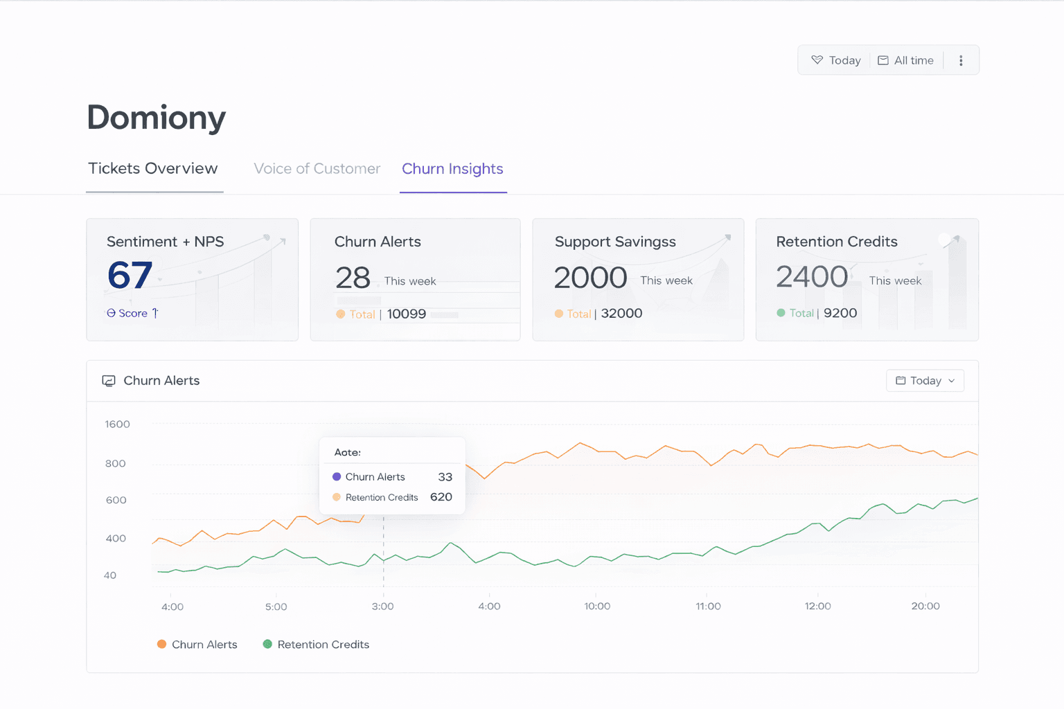Domiony is processing and analysing support tickets and customer messages to surface churn risks, retention opportunities, and Voice-of-Customer patterns — in real time.